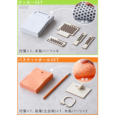 | サッカー:付箋×1、木製パーツ×4 バスケット:付箋×1、鉛筆(土台用)×1、木製パーツ×2 |