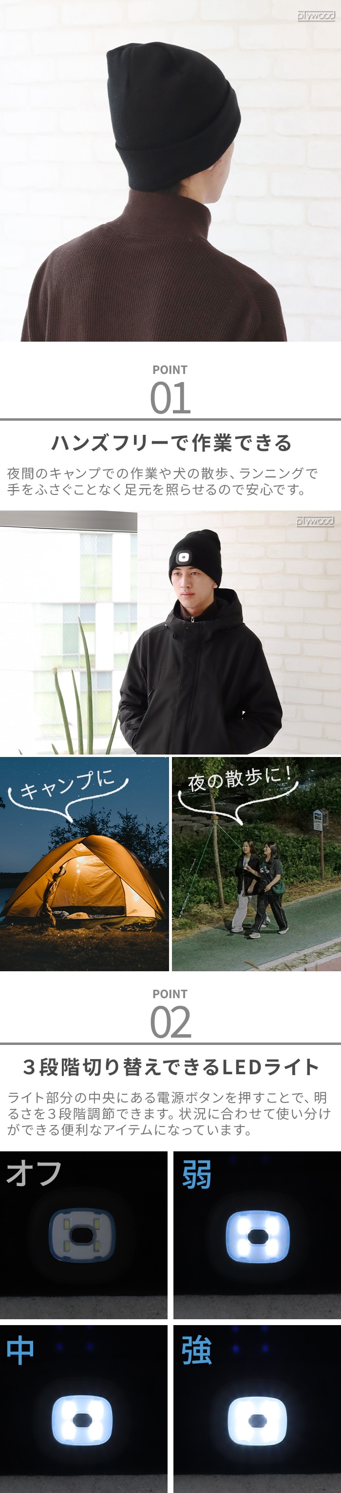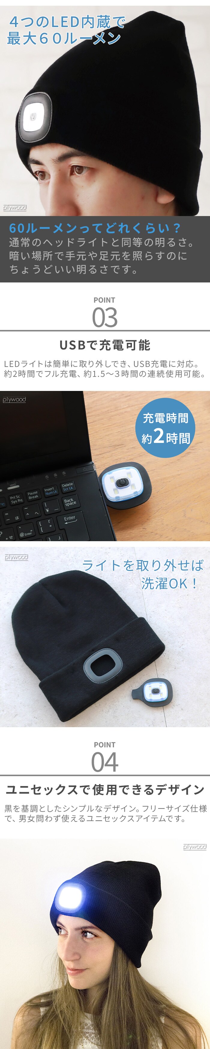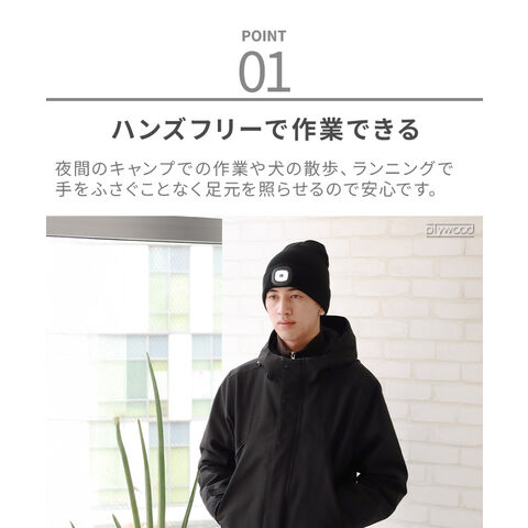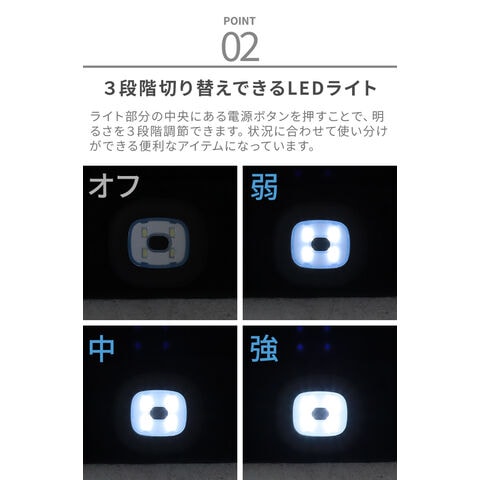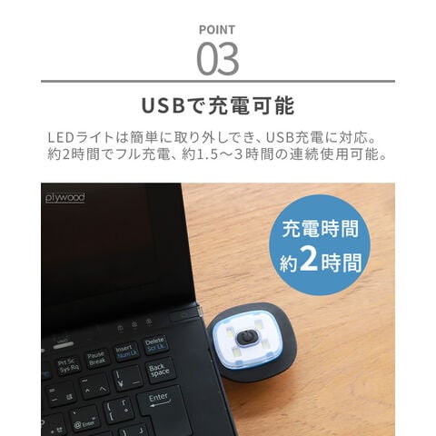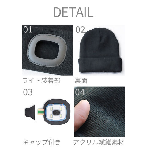 | LEDライトは取り外しが可能です。洗濯する際は必ずLEDを取り外してください。 タンブル乾燥、アイロン、ドライクリーニング不可 LED4個 (最大60ルーメン) 点灯時間:約1.5-3時間 フル充電約2時間 5V/1W/200mA 充電式リチウム電池 ※充電ケーブルは付属していません。 3段階切替(オフ→弱→中→強) |