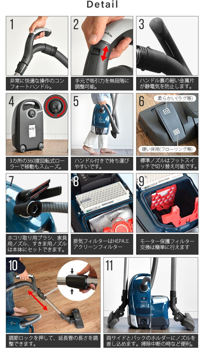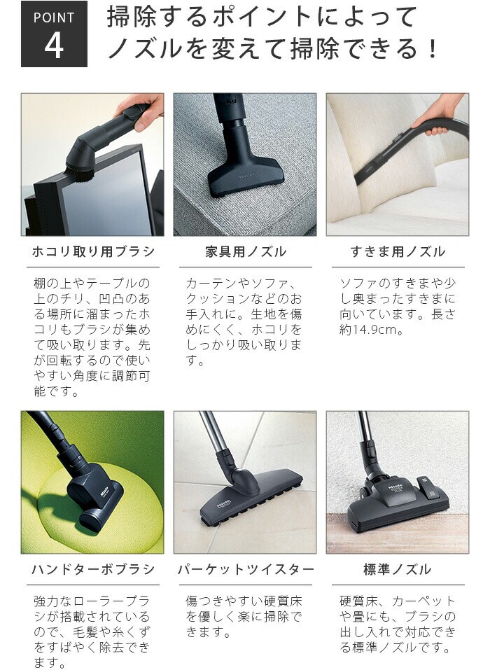 「常により良いものを(Immer besser)」という理念を掲げ、一切妥協しない品質の製品を作り続けている、ドイツの老舗家電ブランド「Miele / ミーレ」から新型掃除機が届きました。 ハイスペックな紙パック式掃除機です。排気される空気がとにかく綺麗で、普通の掃除機では集塵できない、細かなチリや埃も、11層のエアクリーンシステムを搭載する事で、集塵。床だけでなく空気もきれいに。 ノズル、モーター、流線的な空気の流れによる、三位一体のバランスにこだわり、実現した吸引構造と、最大1,000Wの強力な吸引力で、床に落ちた細かなチリ・ホコリ・花粉も根こそぎ吸い取ります。 高い耐久性も特徴で、20年間の使用を想定しています。とてもはげしい耐久テストを実施し、それをパスしてはじめて生産されます。一切妥協のない高い耐久性と品質を保証します。 用途によって使い分けられるノズル付属で、パソコンモニターや家具の隙間、カーテンやソファなど無理なく掃除することができます。 また人間工学に基づく扱いやすいフォルムや、踏みつけるタイプの電源、掃除を中断する時にノズルを差し込んでおくスタンドホルダーなど、扱いやすいデザインも特徴です。 ミーレの中でも最上位で、楽に10年以上使える頑丈で強力な掃除機です。長期間使用する前提の設計で、支払い価値に見合う製品です。