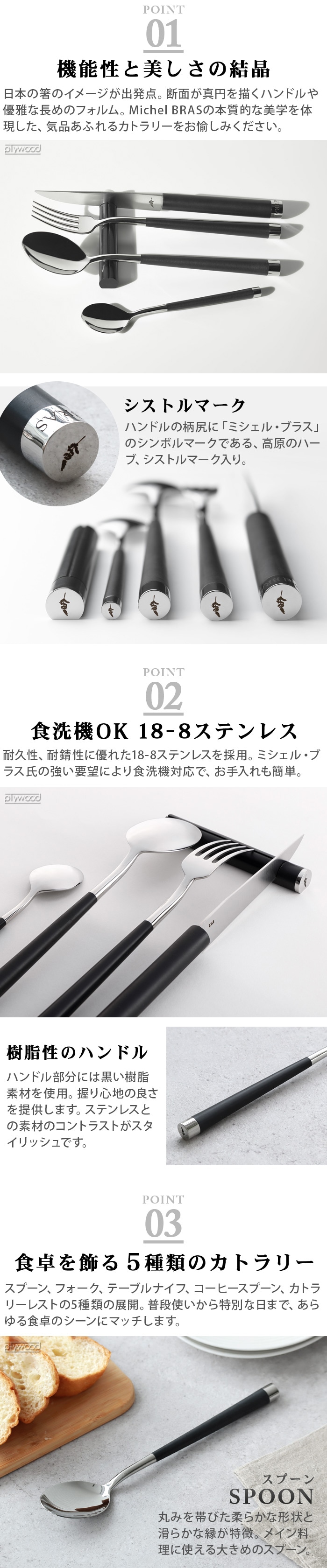| 【スプーン・フォーク・コーヒースプーン・カトラリーレスト】 金属部:18-8ステンレススチール ハンドル:ポリアセタール(耐熱温度100℃) 【テーブルナイフ】 刃体:ステンレス刃物鋼 ハンドル金属部:18-8ステンレススチール ハンドル樹脂部:ポリアセタール(耐熱温度100℃) 鞘:天然木 |
