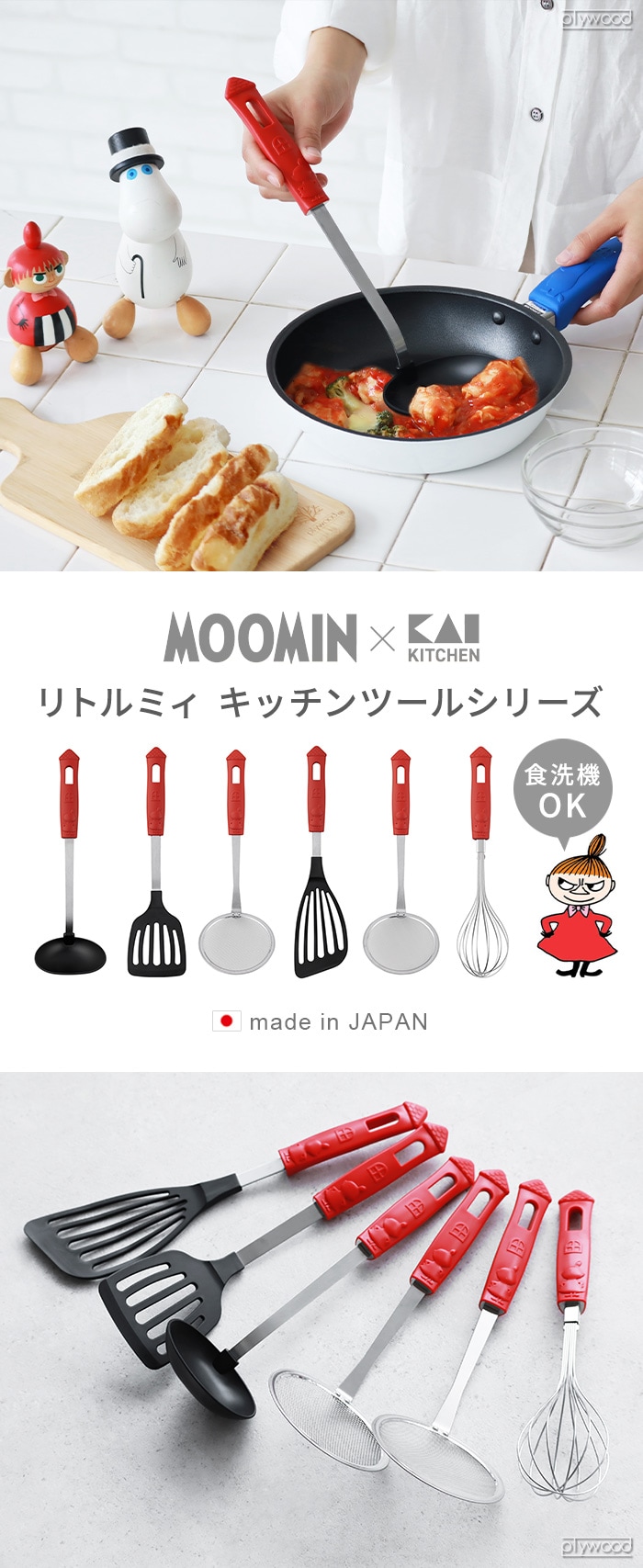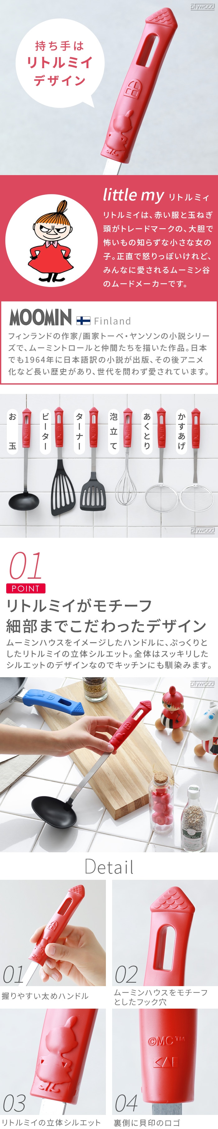 リトルミイのキッチンツール MOOMIN×貝印の、リトルミィをモチーフとしたキッチン用品シリーズ。ぷっくりとしたリトルミイの立体シルエットやムーミンハウスなど細部までこだわったデザインです。持ちやすいハンドル形状と軽くて扱いやすい使用感。フック穴付きで吊り下げ収納もOK。食洗機対応でお手入れラクラク。 |
