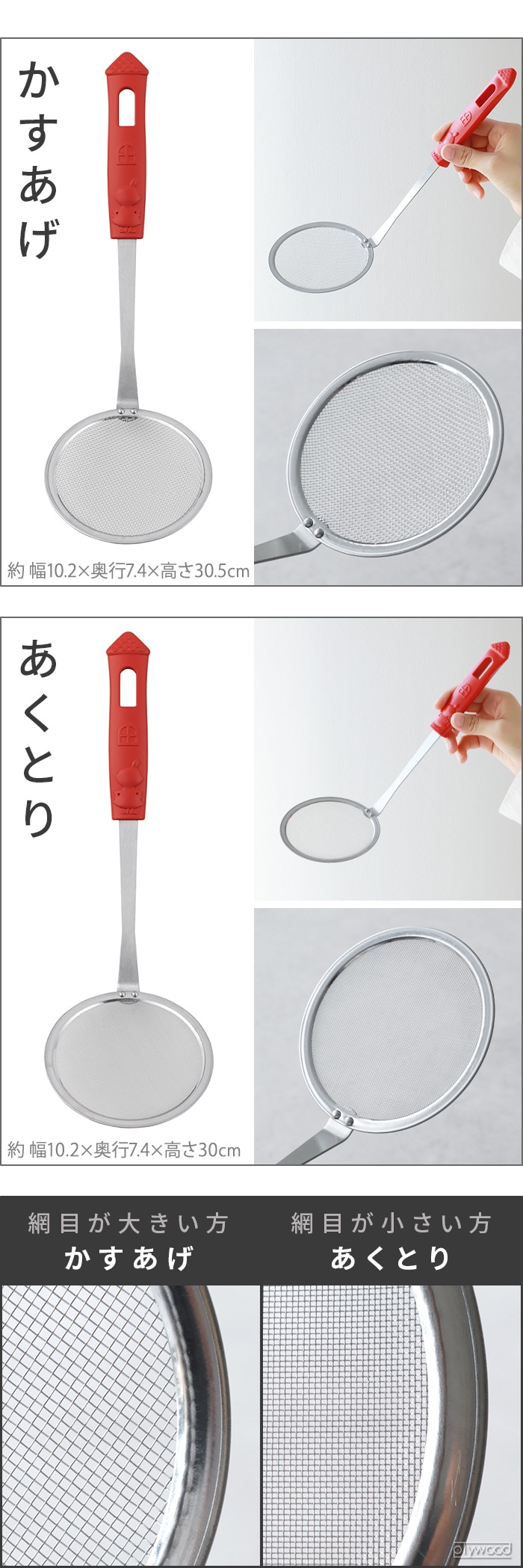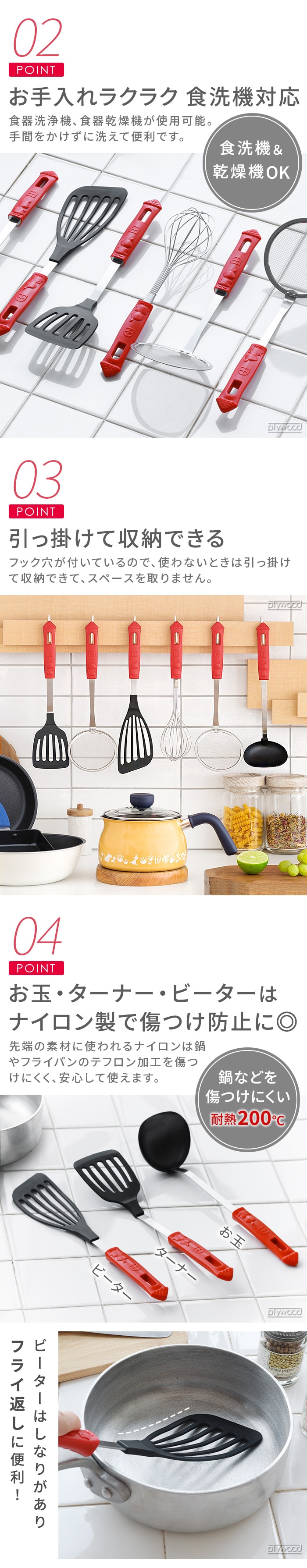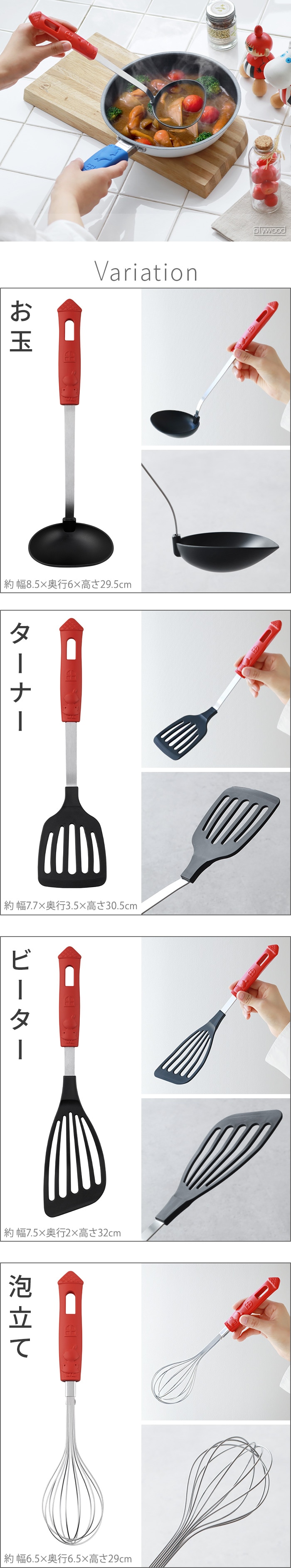 | お玉:(約)幅8.5×奥行6×高さ29.5cm ターナー:(約)幅7.7×奥行3.5×高さ30.5cm かすあげ:(約)幅10.2×奥行7.4×高さ30.5cm ビーター:(約)幅7.5×奥行2×高さ32cm あくとり:(約)幅10.2×奥行7.4×高さ30cm 泡立て:(約)幅6.5×奥行6.5×高さ29cm |