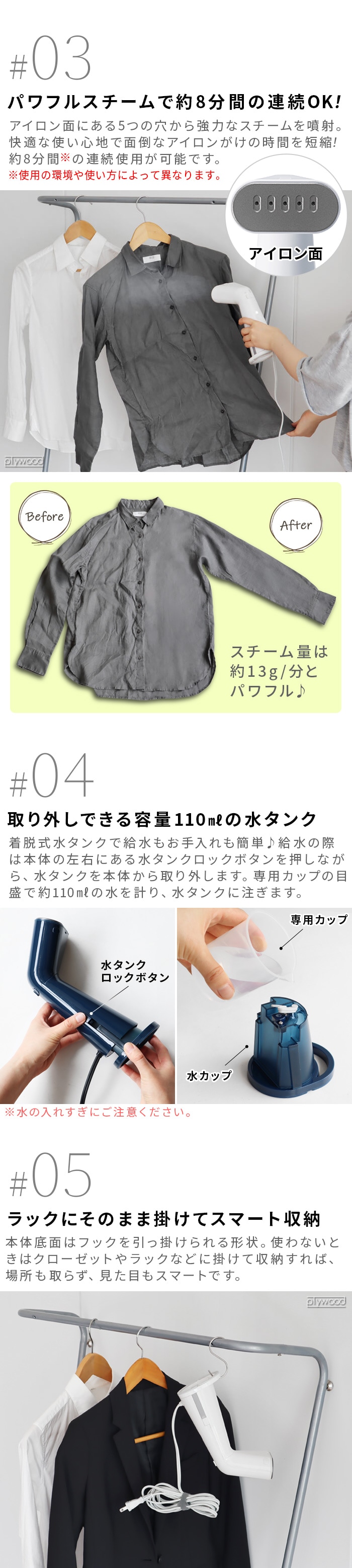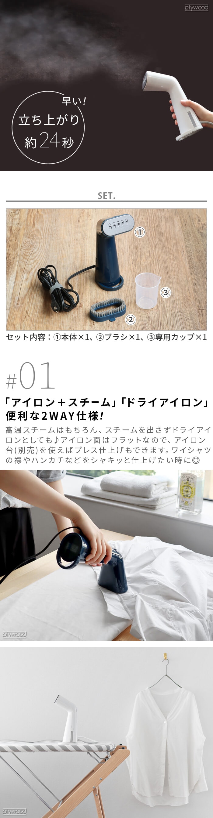 ![]() ハンガーのままシワ取りできる 高温スチーマー 衣類をハンガーにかけたままサッとシワ取りできる「スタイルスチーマー」の登場です。早い立ち上がりで、忙しい朝にもすぐに使える優れもの◎アイロン台を出す手間も省け、高温蒸気でシワシワのシャツもパキっとした仕上がりです!衣類の消臭&除菌にも♪ ![]() ![]() ![]() ![]() ![]() ![]() |