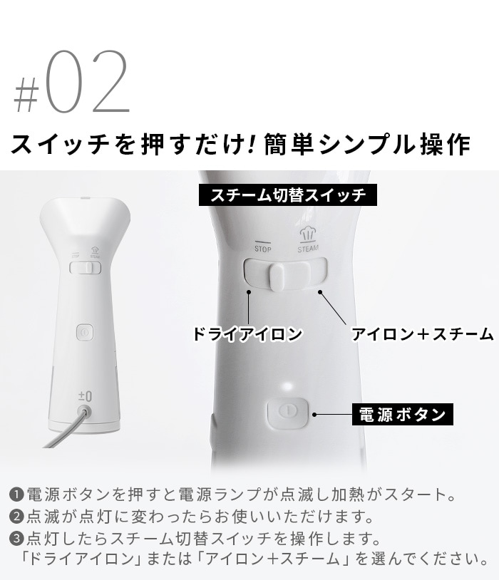 | ・約24秒の素早い立ち上がり ・スチーム量:約13g/分 ・スチーム連続運転約8分(使用の環境や使い方によって異なります) ・温度ヒューズ:216℃ |