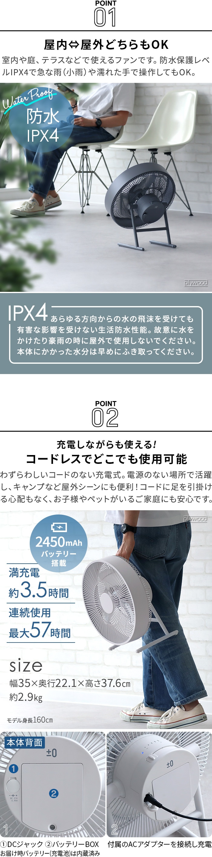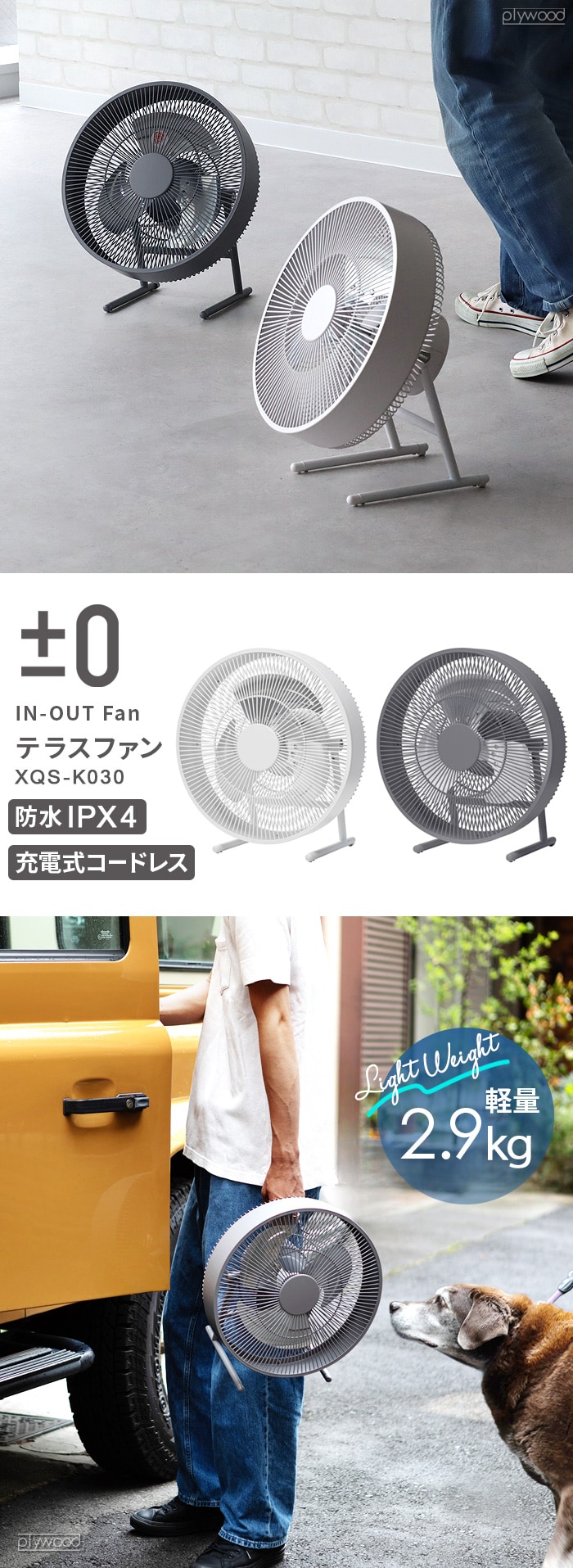 ±0 テラスファン ≪ホワイト XQS-K030≫ プラスマイナスゼロ プラマイゼロ コードレス 扇風機 屋外 リビング 防水 IPX4 キャンプ 庭 BBQ バーベキュー 充電式 持運び 取っ手付き 上下首振り アウトドアファン
