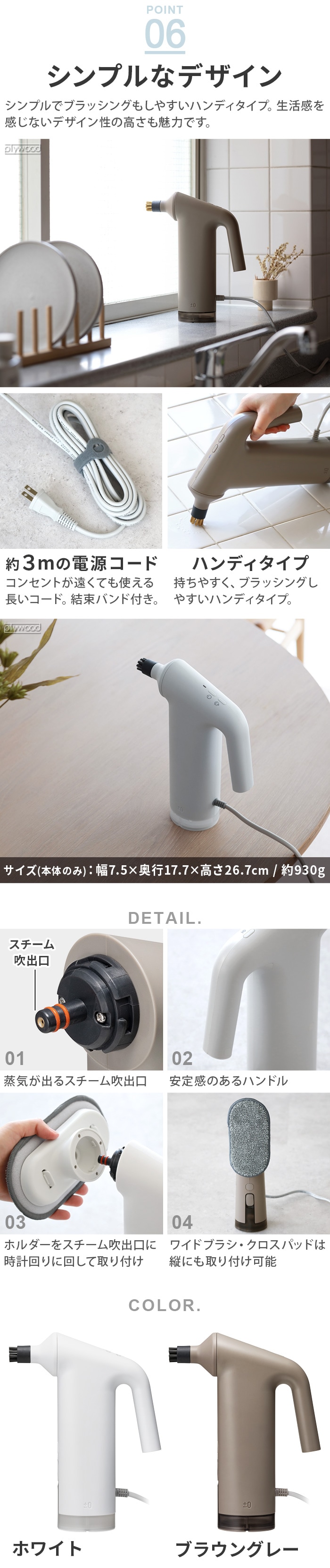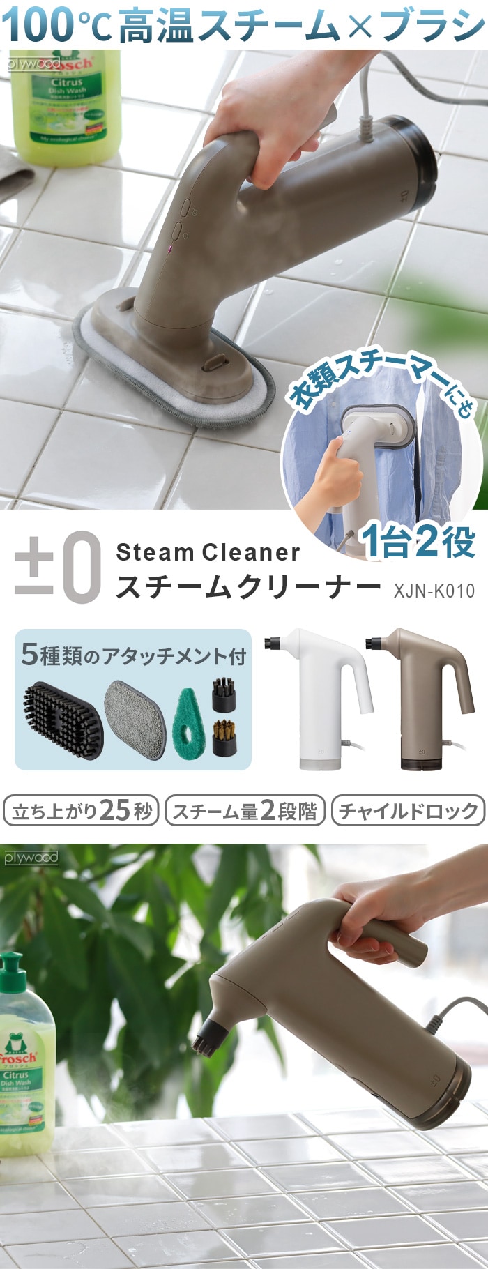 プラスマイナスゼロ スチームクリーナー ≪ブラウングレー XJN-K010≫ ハンディ 洗浄 衣類スチーマー ブラシ ±0 プラマイ 床 ソファ 除菌 脱臭 お風呂 換気扇 浴室 大掃除 キッチン 油汚れ タイル 壁 掃除用品 ギフト