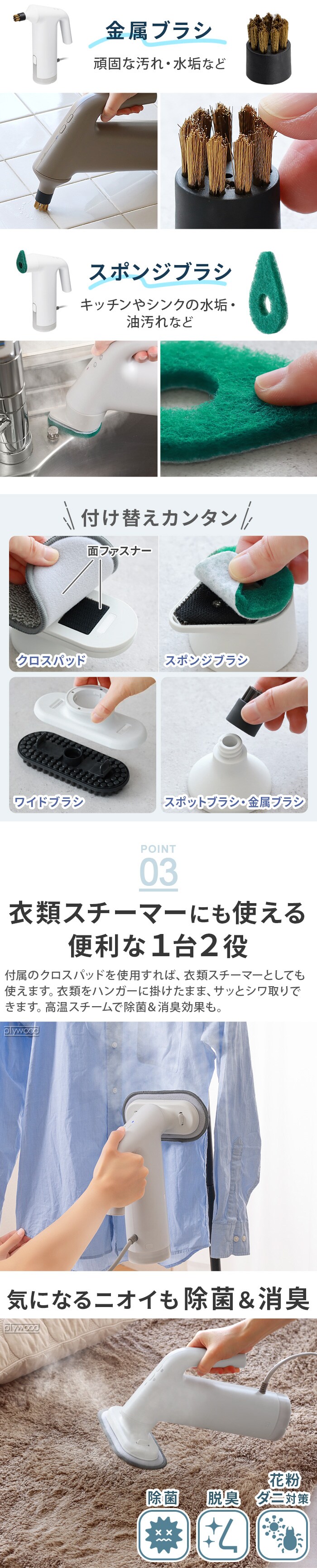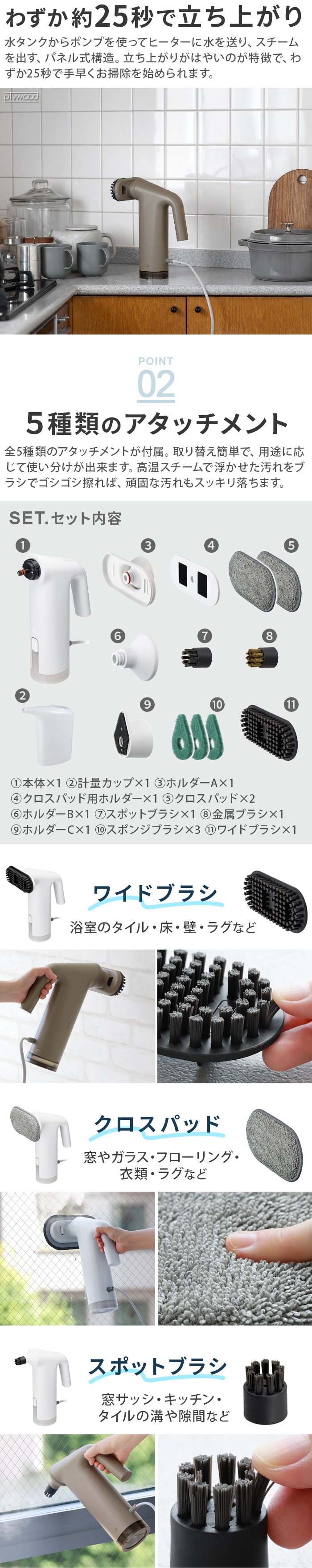 | この商品は、海外ではご使用になれません。 掃除に使用する場合は、やけどを防止するためゴム手袋の着用をおすすめします。 ブラシの回転機能はありません。 色落ちするものや、熱に弱い素材、デリケートな素材、高価なものへのご使用は避けてください。 素材によっては傷が付く恐れがあります。目立たない箇所で試してからご使用ください。 スチーム吹出口付近は高温になるため触れないでください。 使い始めや長時間の放置後に使用を再開する場合、ホースや内部にたまっていた水がスチーム(熱い飛沫含む)が出る場合があります。ご注意ください。 入荷前に生産工場で水を入れて検査をしています。まれに内部に水分が残っていることがあり、電源を入れた際にスチーム(熱い飛沫含む)になって飛び出てくることがあります。ご注意ください。 本製品は水道水を使用する設計になっています。水道水以外の水、洗剤などの液体を入れないでください。 注水するときは必ず電源を切ってください。 衣類スチーマーとして使用する際は、衣類に表示されている取扱絵表示を確認し、説明書の表示にしたがってスチームをかけてください。「スチーム禁止」の表示がある場合は使用しないでください。 初めてスチームをかける衣類は目立たない部分で試してからご使用ください。 ブラシの汚れがひどい時は、台所用中性洗剤で出荒いし、よくすすぎ、しっかりと乾燥させてください。※食洗器や煮沸消毒は不可 |