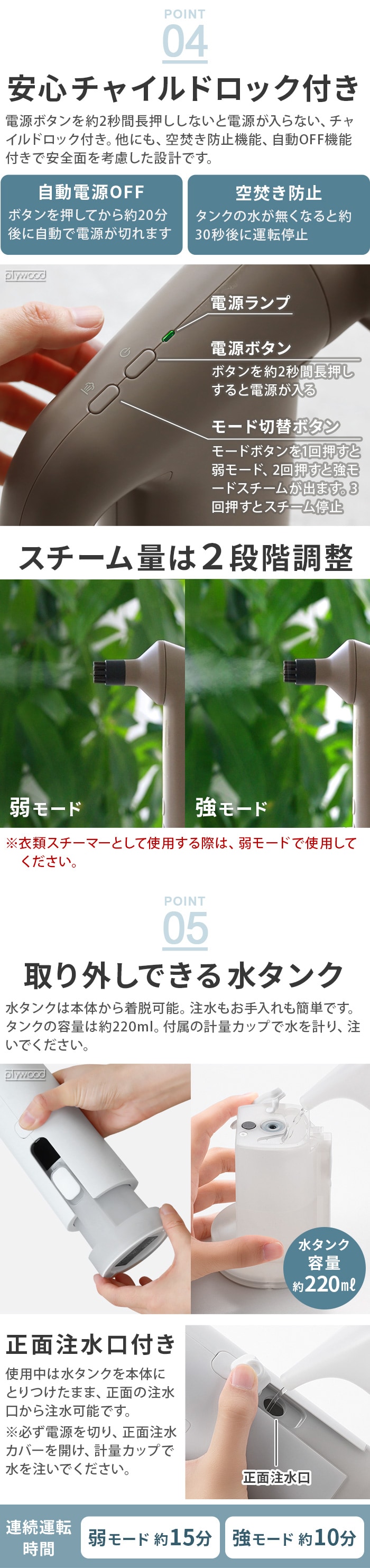 | 弱モード:約15分 強モード:約10分 ※衣類スチーマーとしてご使用の際は弱モードで使用してください。 |