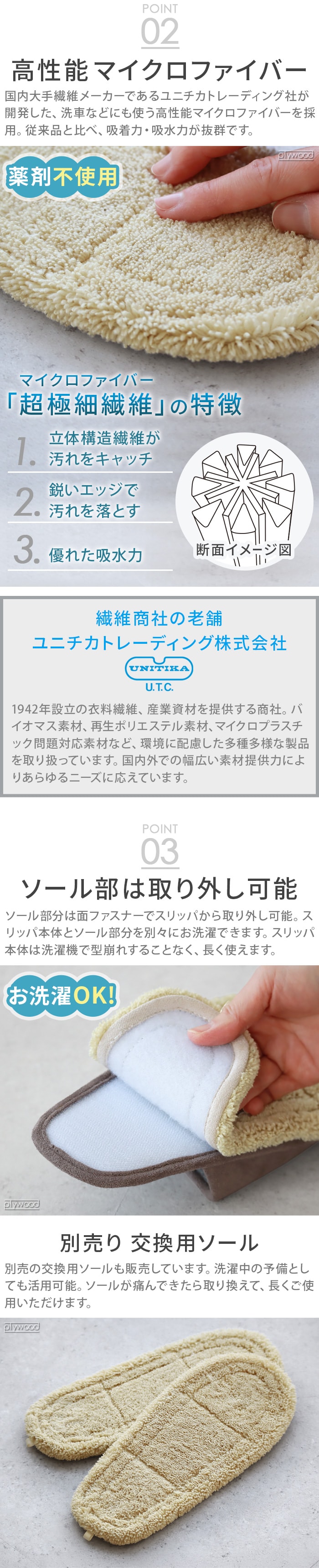 履くだけでお掃除できるスリッパ ヒット商品「激落ち おそうじスリッパ」を±0(プラスマイナスゼロ)がデザイン&機能性をアップデートさせ新登場!繊維商社のユニチカ社の毛足の長いマイクロファイバー生地を採用。毛足が長く、吸着力・吸水力が抜群です。ソール部分は面ファスナーで取り外せるので、取り外してお洗濯も可能。 |