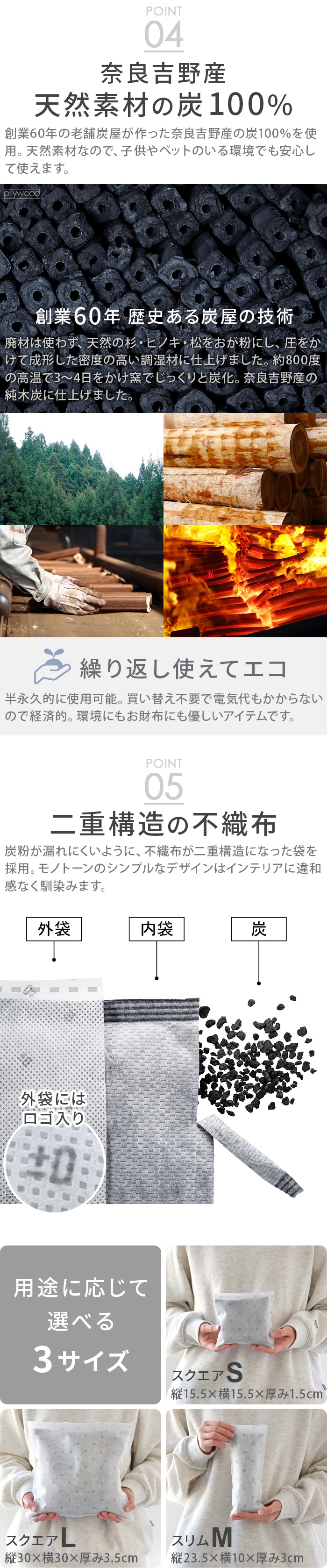 | 木炭、不織布(ポリプロピレン、ポリエステル) |