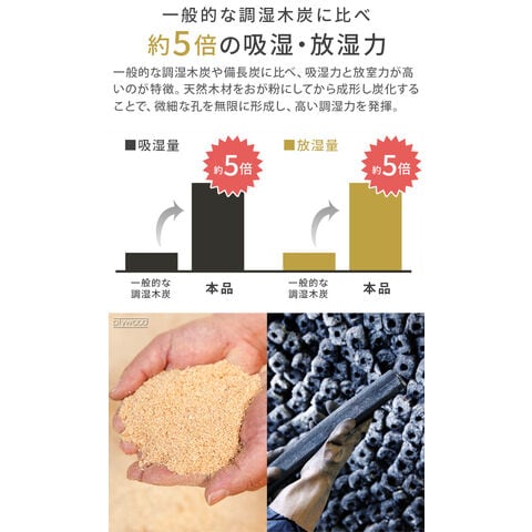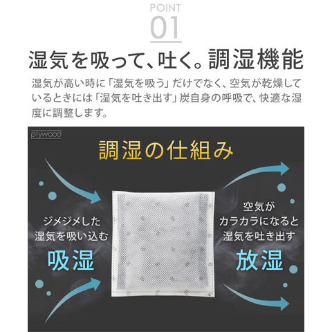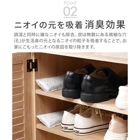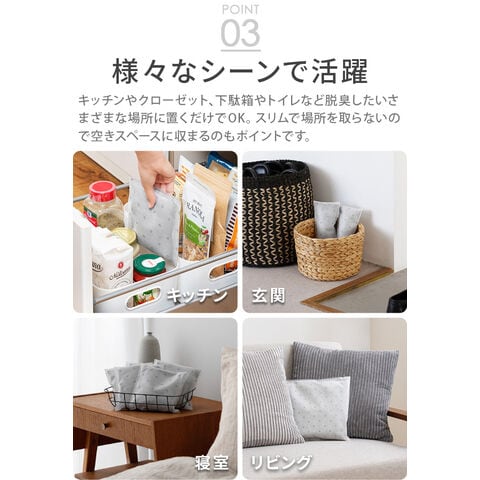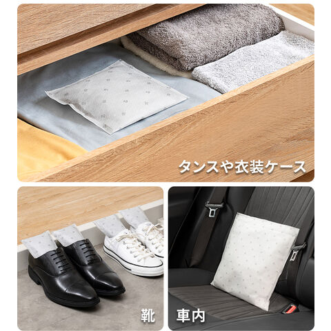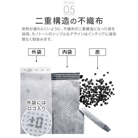 | ご使用状態や環境により、調湿力・消臭力には差があります。 不織布は2重になっています。内側の袋と外側の袋が擦れて、一部が黒く見えることがありますが、品質には問題ありません。 水などで濡らさないでください。 |