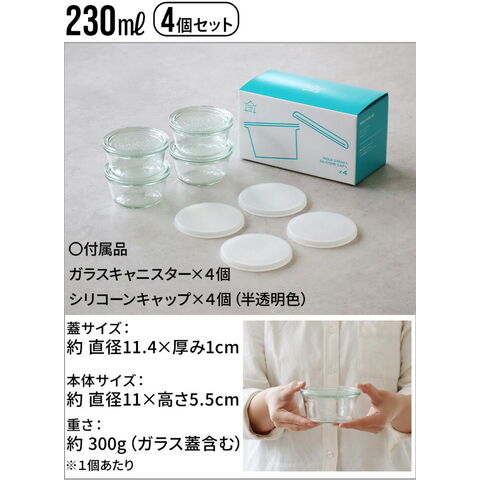 | ≪170ml/4個セット≫ ガラスキャニスター(170ml)×4、シリコーンキャップM(半透明色)×4 ≪230ml/4個セット≫ ガラスキャニスター(230ml)×4、シリコーンキャップL(半透明色)×4 ≪250ml/2個セット≫ ガラスキャニスター(250ml)×2、シリコーンキャップM(オリーブグレー)×2 |