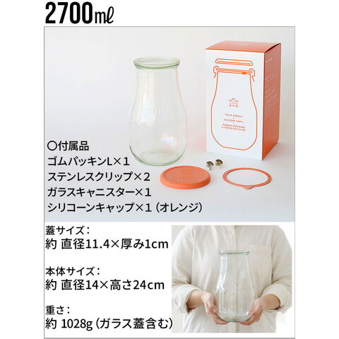 ≪500ml≫ ガラスキャニスター×1、シリコーンキャップ×1 (ミルクティー色) ≪1000ml≫ ガラスキャニスター×1、シリコーンキャップ×1 (半透明色) ≪2700ml≫ ガラスキャニスター×1、シリコーンキャップ×1 (オレンジ)、ゴムパッキンL×1、ステンレスクリップ×2 |