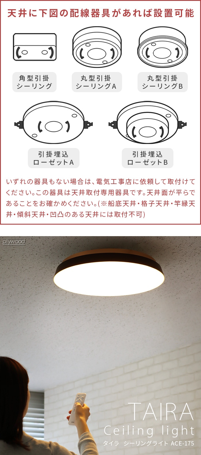 | 天井に下図の配線器具があれば設置可能です。 角型引掛シーリング、丸形引掛シーリングAタイプ、丸形引掛シーリングBタイプ、埋込ローゼット Aタイプ、埋込ローゼット Bタイプ 船底天井、格子天井、竿縁天井、傾斜天井、その他凹凸のある天井には取り付け不可。 天井や梁が本体重量に耐えうる強度であるかご確認ください。 |