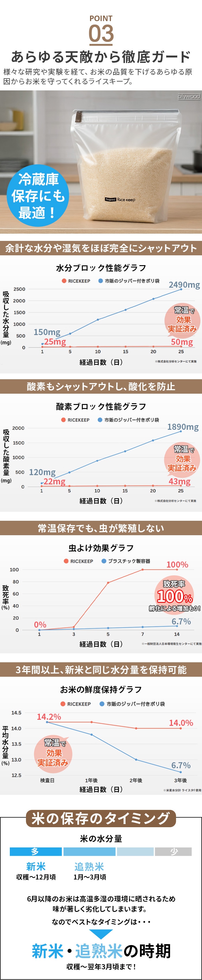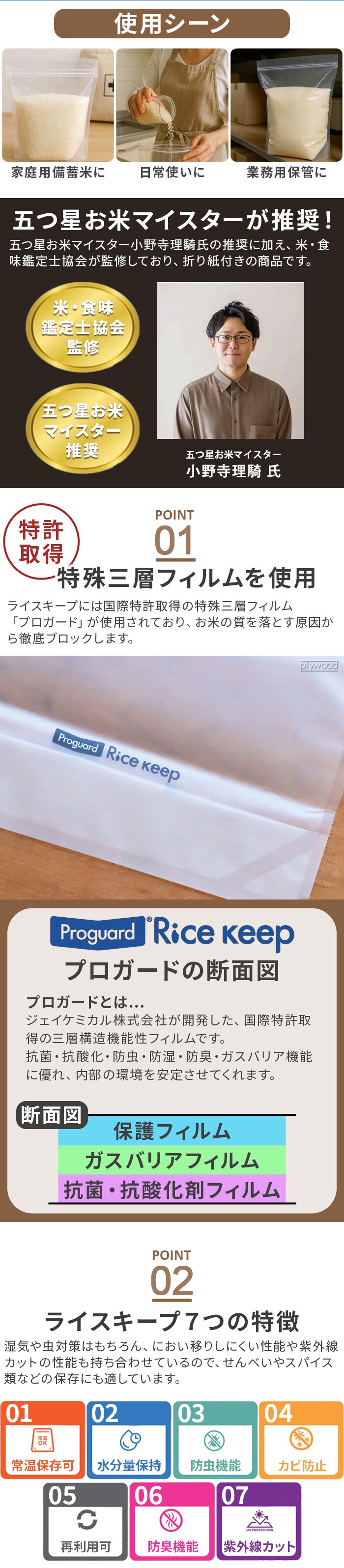 「究極の保存袋」が誕生 お米を「常温」で「水分量を保ったまま」「長期保存」できるライスキープは、お米を常温でおいしく長期保存するための保存袋。特許取得の特殊フィルムが水分や湿気、酸素、紫外線を通しにくくし、乾燥や酸化による劣化を抑制。購入時の水分量と風味をできるだけ保ち、備蓄やまとめ買いにも便利です |