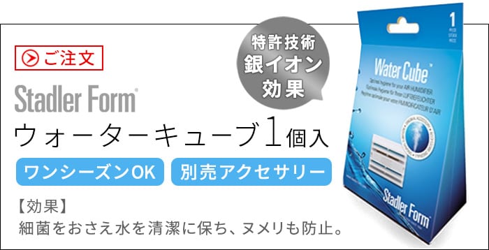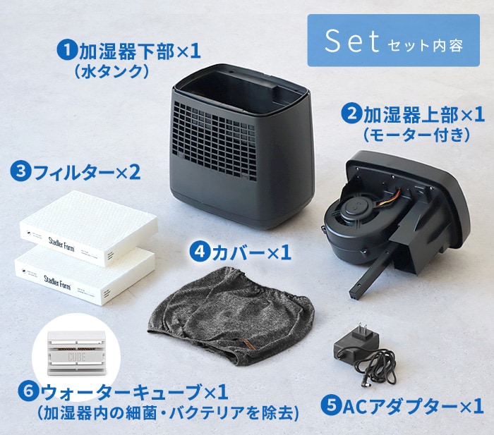 | 加湿器下部(水タンク)×1、加湿器上部(モーター付き)×1、フィルター×2、カバー×1、ACアダプター×1、ウォーターキューブ×1 |