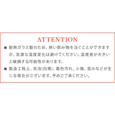 | この商品はガラス製です。衝撃や落下により割れることがありますので、取り扱いには十分ご注意ください。 耐熱ガラス製のため、熱い飲み物を注ぐことができますが、急激な温度変化は避けてください。温度差が大きいと破損する可能性があります。 やわらかいスポンジに中性洗剤を付けて洗ってください。研磨入りスポンジ、金属タワシ、クレンザーなどの使用はガラスを傷つける可能性があるため、避けてください。 割れる恐れがあるため、小さなお子様の手の届かない場所で保管してください。 ハンドメイドのため、形状や模様に個体差がございます。 製造工程上、気泡(白濁)、着色汚れ、小傷、歪みなどが生じる場合がございます。予めご了承ください。 |