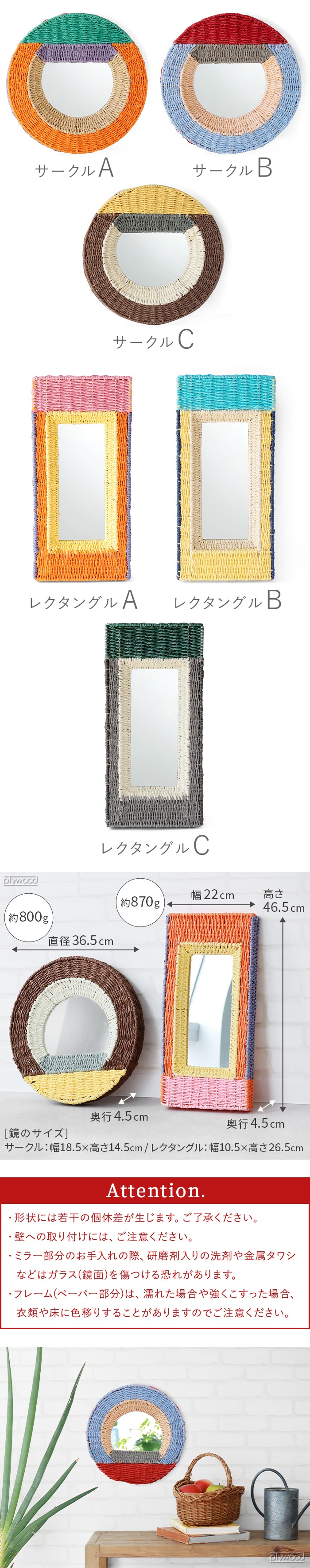 形状には若干の個体差が生じます。ご了承ください。 壁への取り付けには、ご注意ください。 取付け不良などによる事故には、一切責任を負いかねます。ご了承ください。 ミラー部分のお手入れの際、研磨剤入りの洗剤や金属タワシなどはガラス(鏡面)を傷つける恐れがあります。柔らかい布で拭き、油や取れにくい汚れは、市販の中性洗剤かガラスクリーナーで下拭きし、乾燥後、乾いた布でよく磨いてください。 フレーム(ペーパー部分)は、濡れた場合や強くこすった場合、衣類や床に色移りすることがありますのでご注意ください。 カビの原因になりますのでフレームのぺーパー部分を水に濡らさないでください。万一、濡れた場合は風通しの良い場所で乾燥させてからご使用ください。 火のそばに置かないでください。 |
