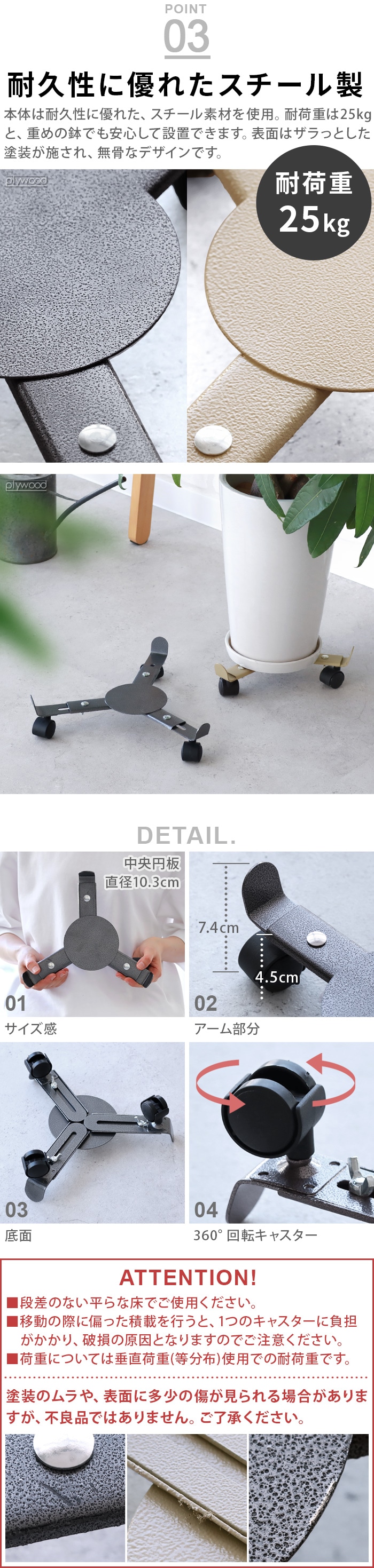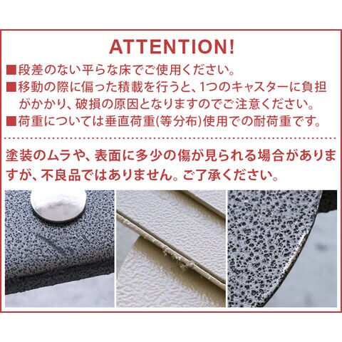 | 本品は室内専用です。 段差のない平らな床でご使用ください。 移動の際に偏った積載を行うと、1つのキャスターに負担がかかり、破損の原因となりますのでご注意ください。 荷重については垂直荷重(等分布)使用での耐荷重です。 塗装のムラや、表面に多少の傷が見られる場合がありますが、不良品ではありません。ご了承ください。 |