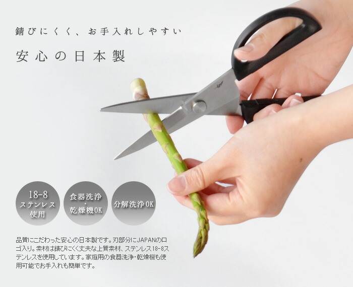 ■ご注意…通常のキッチンハサミよりも刃が鋭くなっています。骨やクルミなど硬い食材にはご使用にならないで下さい。刃こぼれの原因となります/調理の目的以外に使用しないで下さい/使用前に食器用洗剤を付けてスポンジなどで洗って下さい/クレンザーや金属タワシ等は製品を傷つけますので使用しないで下さい