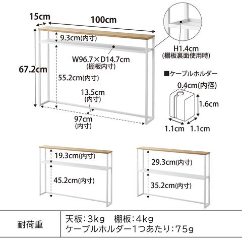 | ≪外寸≫ 本体:(約)幅100×奥行15×高さ67.2cm ケーブルホルダー:(約)幅1.1×奥行1.1×高さ1.6cm ≪内寸≫ ケーブルホルダー内径:(約)4mm 棚板:(約)幅96.7×奥行14.7cm 棚板より上部:(約)高さ9.3・19.3・29.3cm 棚板より下部:(約)高さ55.2・45.2・35.2cm |