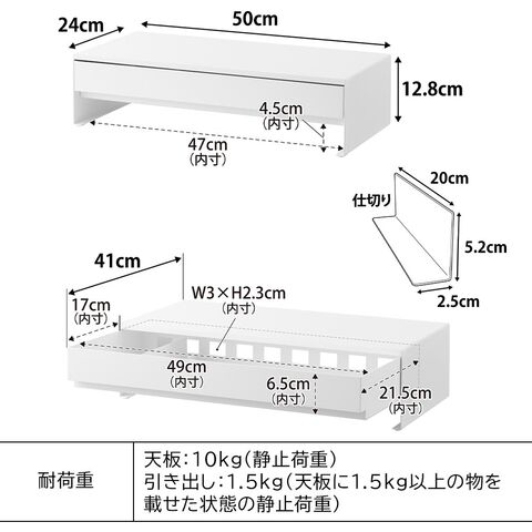 | (約)幅50×奥行24-41×高さ12.8cm 天板:(約)幅50×奥行24cm 引き出し:(約)幅49×奥行21.5×高さ6.5cm(有効内寸)(開口部最大:約奥行17cm) ケーブル通し口1か所あたり:(約)幅3×高さ2.3cm 引き出し下:(約)幅47×奥行24×高さ4.5cm |