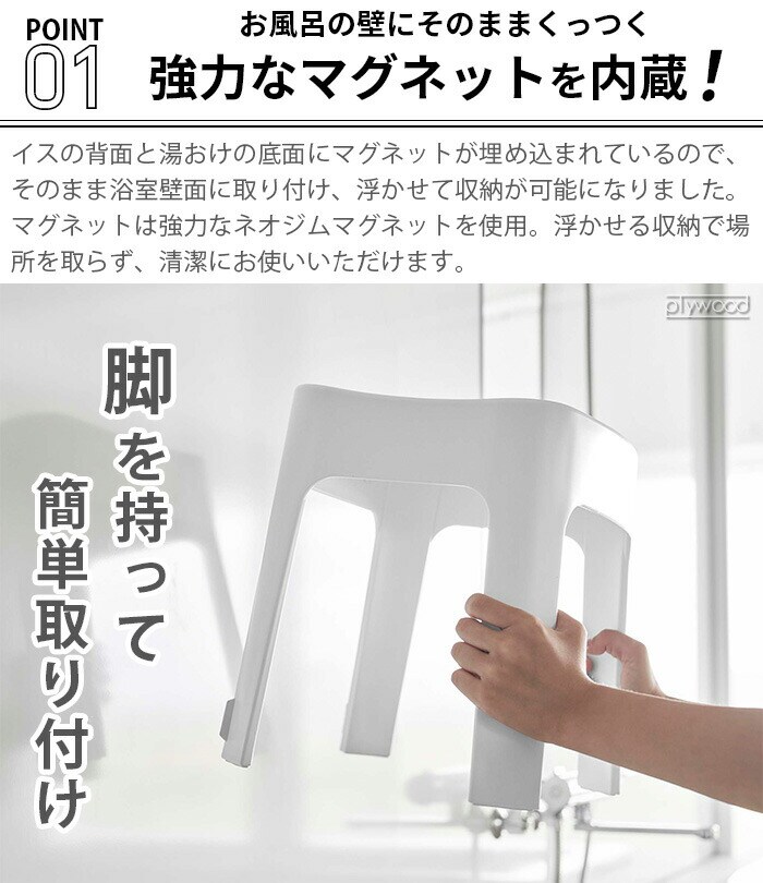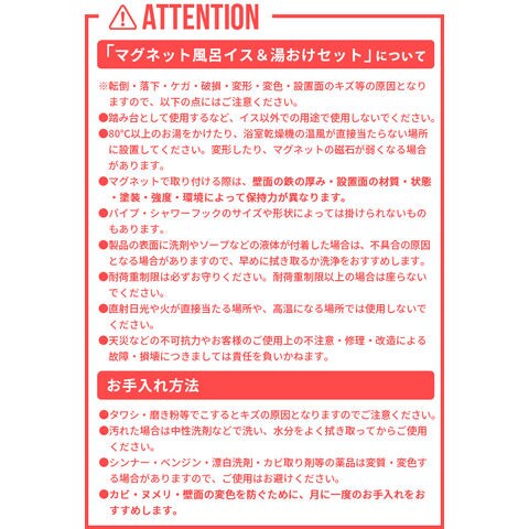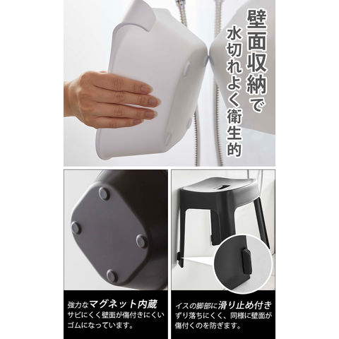 ※転倒・落下・ケガ・破損・変形・変色・設置面のキズ等の原因となりますので、以下の点にはご注意ください。 ●踏み台として使用するなど、イス以外での用途で使用しないでください。 ●80℃以上のお湯をかけたり、浴室乾燥機の温風が直接当たらない場所に設置してください。変形したり、マグネットの磁石が弱くなる場合があります。 ●マグネットで取り付ける際は、壁面の鉄の厚み・設置面の材質・状態・塗装・強度・環境によって保持力が異なります。 ●パイプ・シャワーフックのサイズや形状によっては掛けられないものもあります。 ●製品の表面に洗剤やソープなどの液体が付着した場合は、不具合の原因となる場合がありますので、早めに拭き取るか洗浄をおすすめします。 ●耐荷重制限は必ずお守りください。耐荷重制限以上の場合は座らないでください。 ●直射日光や火が直接当たる場所や、高温になる場所では使用しないでください。 ●天災などの不可抗力やお客様のご使用上の不注意・修理・改造による故障・損壊につきましては責任を負いかねます。 |