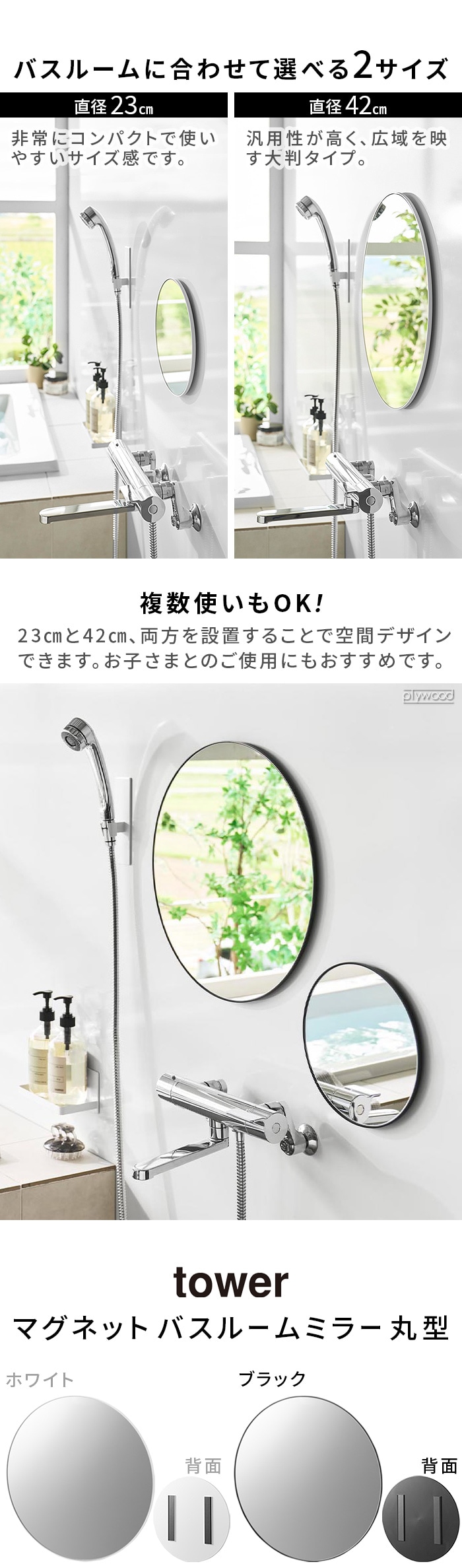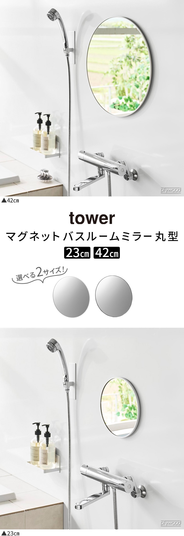 タワー 山崎実業 tower マグネットバスルームミラー 丸型 23cm ≪ホワイト 10175≫ YAMAZAKI 鏡 お風呂ミラー ガラス 曇り止め加工 交換 賃貸OK おしゃれ 磁石 新生活 ギフト