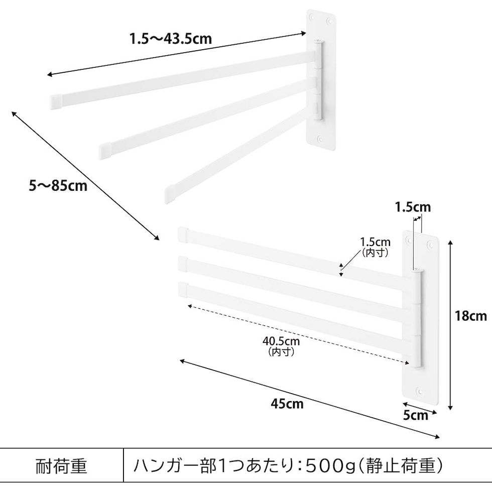 | (約)幅45×奥行1.5×高さ18cm 使用時:(約)幅5-85×奥行1.5-43.5×高さ18cm ハンガー部1つあたり内寸:(約)奥行40.5×高さ1.5cm(滑り止め部分含まず) |