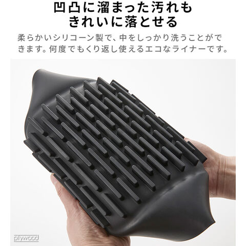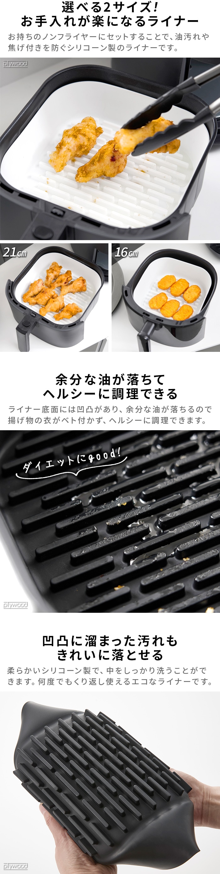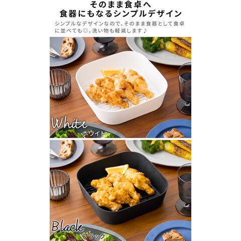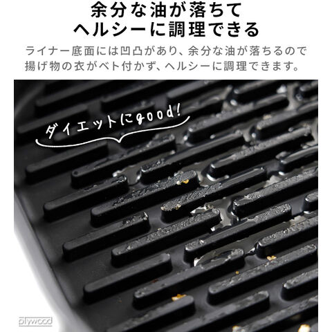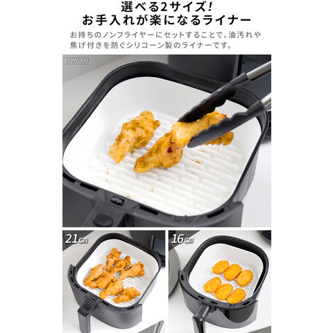 くり返し何度も使えてエコ! 油も切れるノンフライヤーライナー お持ちのノンフライヤーのお手入れが楽になるシリコーン製ライナー。ノンフライヤーの内鍋を保護し、食材が鍋底に焦げ付くのを防ぎます。底面の凹凸により余分な油が落ち、ヘルシーに調理も♪柔らかいシリコーン製なので凹凸の間もしっかり洗うことができます。 |