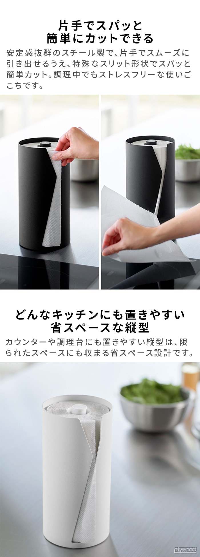 キッチンペーパーを隠して生活感をオフ! 片手でカットできるホルダー スタイリッシュなデザインでキッチンペーパーを隠して収納。キッチンまわりの生活感をスッキリとオフできるキッチンペーパーホルダーです。スチール製のホルダーで安定感抜群!片手でスムーズに引き出せるうえ、特殊なスリット形状で簡単にカットでき、調理中でもストレスなく使えます。選べる2サイズです。 ※セット販売ではありません。 |