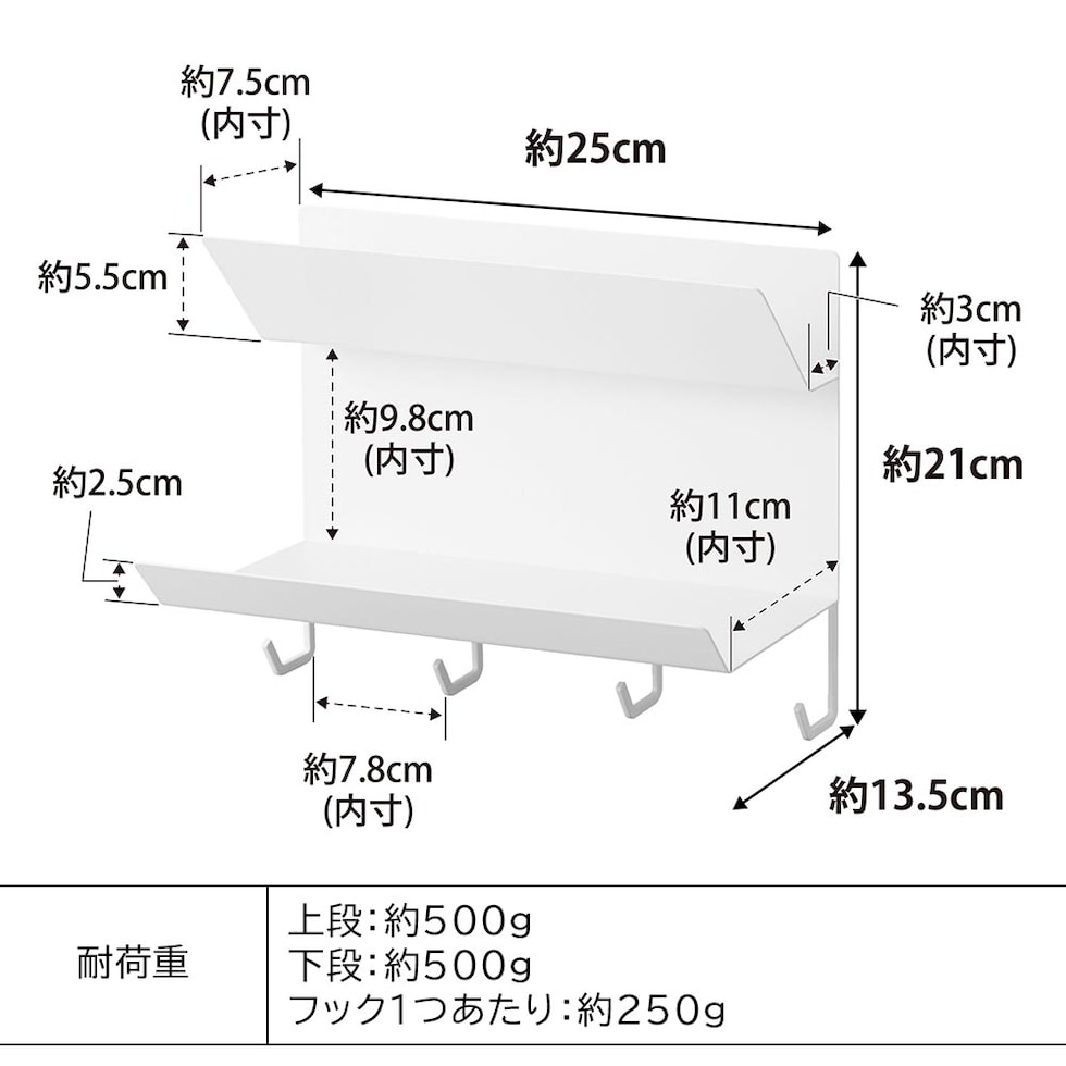 | (約)幅25×奥行13.5×高さ21cm 上段内寸:(約)幅25×奥行3×高さ5.5cm 下段内寸:(約)幅25×奥行11×高さ9.8cm フック:(約)奥行2.2×高さ5.5cm |
