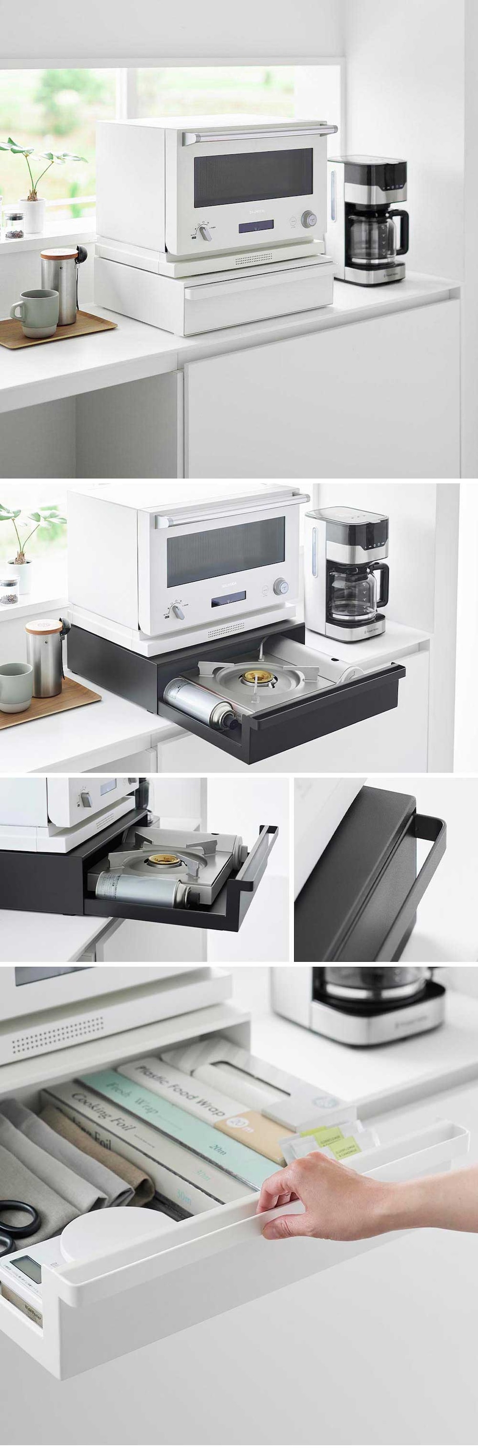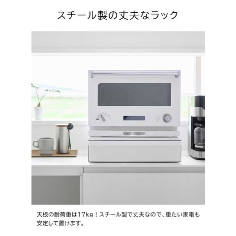 電子レンジなどのキッチン家電の下に、カセットコンロや卓上IHの収納スペースができる便利なラックです。 ラックの天板の耐荷重は17kg! 丈夫なスチール製なので、電子レンジなどの重たい家電をラックの上に置けます。 引き出しにはカセットコンロとボンベをまとめて収納できます。 手前に大きく引き出せるので、カセットコンロを出し入れしやすいです。 引き出しはキッチン小物の収納場所としても使えます。 今まで出しっぱなしにしていたラップやアルミホイルを引き出しにしまうことで、 キッチンをすっきりと整理整頓でき、生活感も隠せます。 どんな雰囲気のキッチンにも馴染む、シンプルなデザインのラックです。