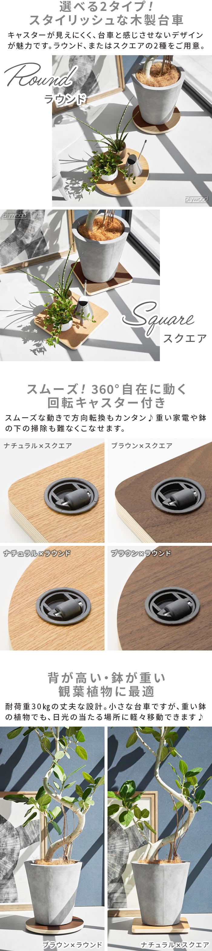 観葉植物や家電もラクラク動かせる! 木製のおしゃれな台車 インテリアに馴染む木製のスタイリッシュなデザインの木製台車です。家電や重い鉢もスムーズに移動できるので、掃除の際もラクラク◎。360度回転するキャスターは目立たない設計で、見た目もスマートです♪ ※セット販売ではありません。 |