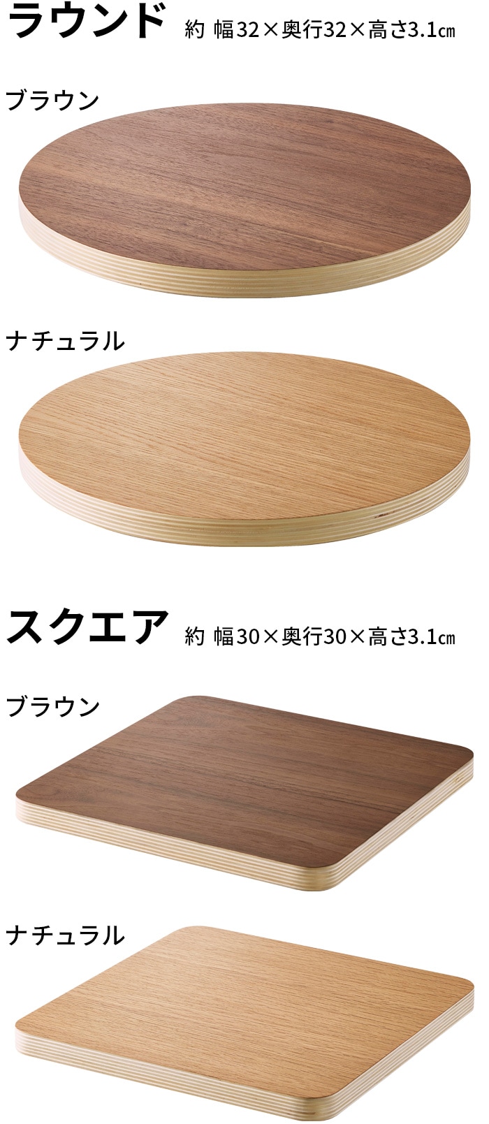| ラウンド:(約)幅32×奥行32×高さ3.1cm スクエア:(約)幅30×奥行30×高さ3.1cm |