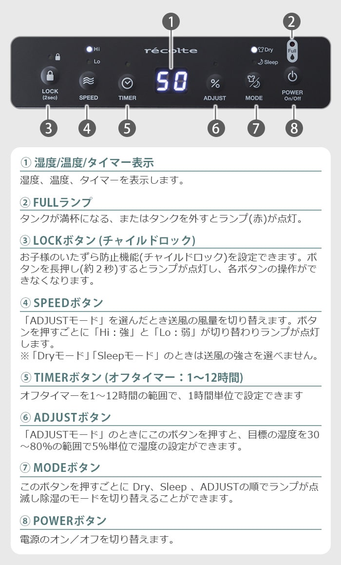 | 3種類の運転モード搭載【ADJUST】【Dry】【Sleep】 使用後に自動で内部に送風&乾燥 ・霜取り機能付き1~12 時間のオフタイマー(1時間単位) 使用後に自動で内部に送風&乾燥 ・霜取り機能付きチャイルドロック機能 使用後に自動で内部に送風&乾燥 ・霜取り機能付き |