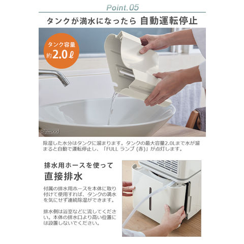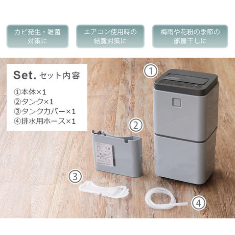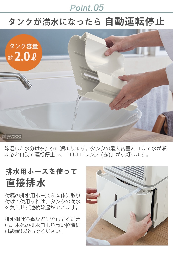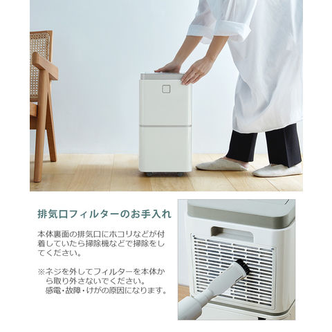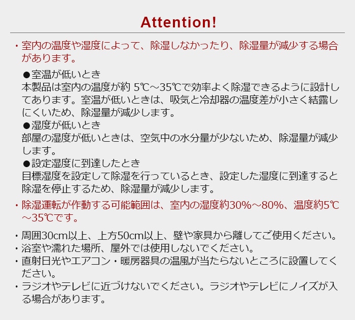 送風量をHi:強に設定すると、運転音はやや大きくなります。 DRYモードは送風量がHi:強の為、運転音はやや大きめです。 室内の温度や湿度によって、除湿しなかったり、除湿量が減少する場合があります。 【室温が低いとき】 本製品は室内の温度が約 5℃~35℃で効率よく除湿できるように設計してあります。室温が低いときは、吸気と冷却器の温度差が小さく結露しにくいため、除湿量が減少します。 【湿度が低いとき】 部屋の湿度が低いときは、空気中の水分量が少ないため、除湿量が減少します。 【設定湿度に到達したとき】 目標湿度を設定して除湿を行っているとき、設定した湿度に到達すると除湿を停止するため、除湿量が減少します。 除湿運転が作動する可能範囲は、室内の湿度約30%~80%、温度約5℃~35℃です。 周囲30cm以上、上方50cm以上、壁や家具から離してご使用ください。 浴室や濡れた場所、屋外では使用しないでください。 直射日光やエアコン・暖房器具の温風が当たらないところに設置してください。 ラジオやテレビに近づけないでください。ラジオやテレビにノイズが入る場合があります。 |