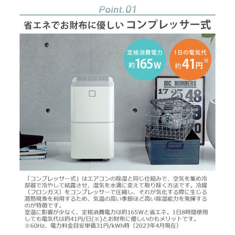 | 50Hz:6L / 60Hz:7L ※室温27℃、相対湿度60%を維持し続けた状態での1日当たりの除湿量です。 |