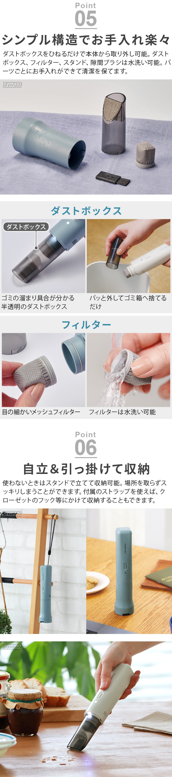 | LEDライト搭載(動作中は点灯し、停止すると消灯。) ダストボックス、フィルター、スタンド、隙間ブラシは水洗い可能。 |