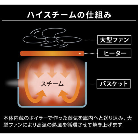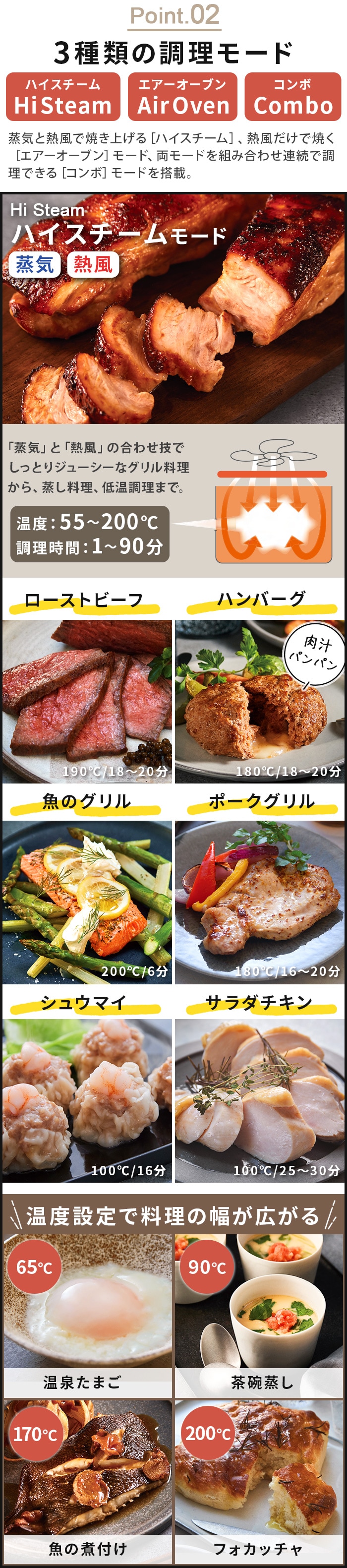| 【Hi Steam】 温度設定:55~200℃(5℃単位)/タイマー:1~90分(1分単位) 【Air Oven】 温度設定:80~200℃(5℃単位)/タイマー:1~90分(1分単位) 【combo】 Hi Steam→Air Oven または Air Oven→Hi Steam |