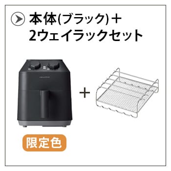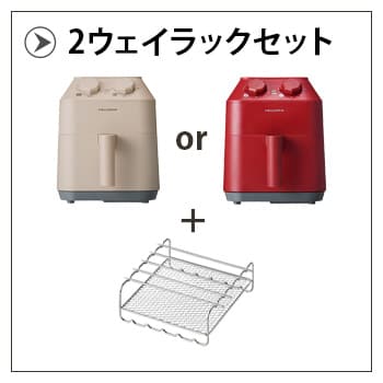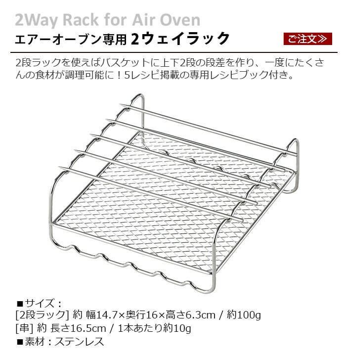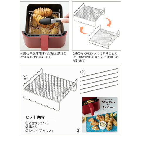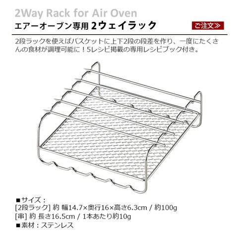 | 丸洗い可 食器洗い乾燥機、食器乾燥機の使用可。 直火、ガスコンロ、IH、オーブン、電子レンジは使用不可。 油を大量に使う料理はしないでください。 2wayラックは必ずエアーオーブン本体に付属の内アミにのせてご使用ください。 |