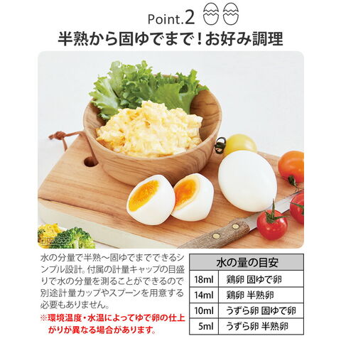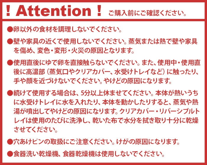| 卵以外の食材を調理しないでください。 壁や家具の近くで使用しないでください。蒸気または熱で壁や家具を傷め、変色・変形・火災の原因となります。 使用直後にゆで卵を直接触らないでください。また、使用中・使用直後に高温部(蒸気口やクリアカバー、水受けトレイなど)に触ったり、手や顔を近づけないでください。やけどの原因になります。 続けて使用する場合は、5分以上休ませてください。本体が熱いうちに水受けトレイに水を入れたり、本体を動かしたりすると、蒸気や熱湯が噴出してやけどの原因になります。クリアカバー・リバーシブルトレイは使用のたびに洗浄し、乾いた布で水分を拭き取り十分に乾燥させてください。 穴あけピンの取扱にご注意ください。けがの原因になります。 食器洗い乾燥機、食器乾燥機は使用しないでください。 |