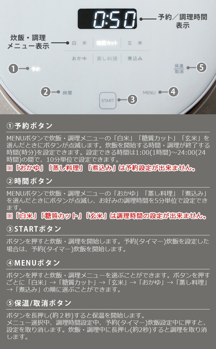 | 6種類の調理モード: 糖質カット、白米、玄米、おかゆ、蒸し料理、煮込み 予約炊飯機(10分単位) ※「おかゆ」「蒸し料理」「煮込み」は予約設定不可。 炊飯を開始する時間・調理が終了する時間(時分)を設定できます。設定できる時間は1:00(1時間)~24:00(24時間)の間です。 自動保温機能(24時間) 白米、玄米モードの際に、炊飯後自動で保温に切り替わります。 調理時間設定機能(5分単位) ※「白米」「糖質カット」「玄米」は調理時間の設定不可。 本体、電気コード以外は丸洗いOK ※食洗機、熱湯消毒、電子レンジは使用不可 |