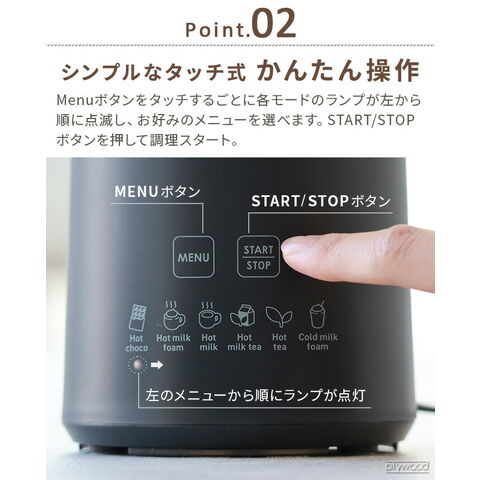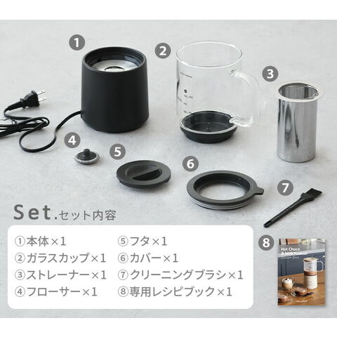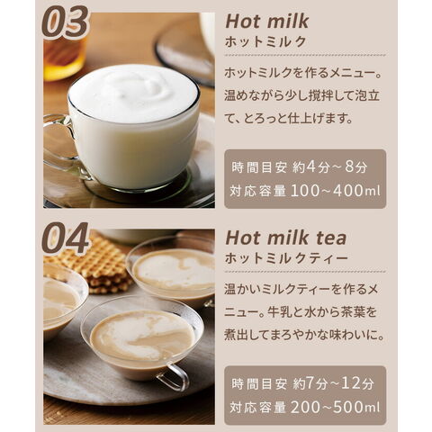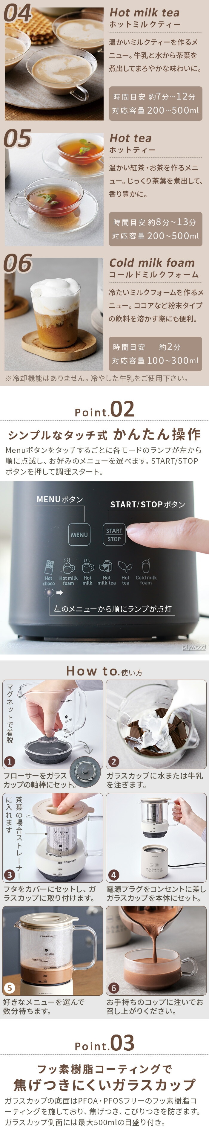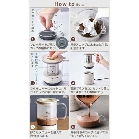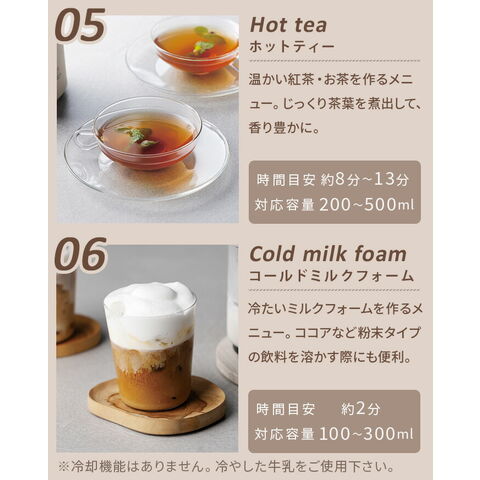 ・本体(土台部分)は丸洗い不可。 ・食器洗浄機・食器乾燥機は使用不可。 ・金属たわし・ナイロンたわし・シンナー・ベンジン・アルコールなどは使用しないでください。 ・使用中や使用後しばらくは、ガラスカップ・本体などの高温部に直接触れないでください。 フタをセットしないで動作させたり、動作中に水または牛乳を足さないでください。 水や牛乳など水分が入っていない状態で使用しないでください。 動作中はガラスカップを取り外さないでください。 Hot teaを使用するときは、コンデンスミルクやジャムなどの焦げ付きやすいものは入れないでください。 液体の量が少ない、または茶葉が多い場合、茶葉が液体に十分に浸らないことがあります。MAXラインを超えない範囲で液体の量を増やすか、茶葉の量を調節してください。 Cold milk foamには冷却機能はありません。冷蔵庫でよく冷やした牛乳を使用してください。 工場出荷時に水を使った検査をして性能を確認しています。まれに、本体内部に白い跡(水道水に含まれるカルキ)が付着していることがありますが、検査時の水の跡ですので、お手入れの上、安心してご使用ください。 製品には保護装置が入っています。空焚きや連続使用などで本体が高温になった場合、ランプが点滅しブザー音が鳴り続きます。※電源プラグをコンセントから抜き、30分以上休ませてから再度動作させてください。 |