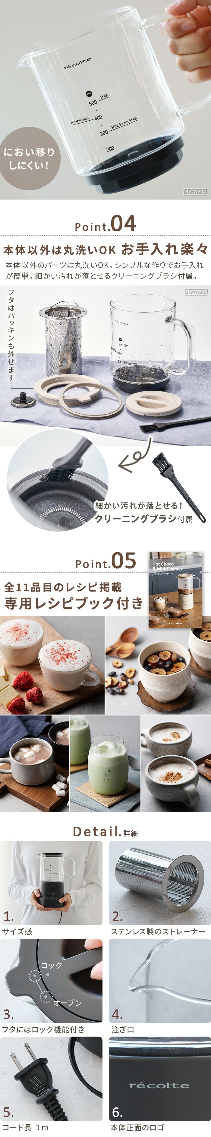 レコルト recolte Hot Choco & Milk Foamer RMT-3 ≪クリームホワイト≫ レシピ付き ミルクフォーマー 電動 自動 ミルク泡立て器 自動温め 撹拌 クリーマー ホットチョコ ギフト