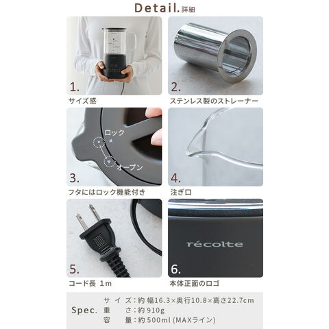 ※2025年11月にモデル変更しました。 「recolte Milk Tea Maker RMT-1」の後継モデルです。旧モデルとは仕様が異なります。 【変更箇所】 ・デザインが変更されました。 ・調理モードが追加されました。 ・サイズ、重量、素材、容量、付属品、消費電力が変更されました。 |