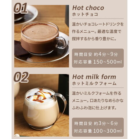 MAXライン:約500ml ホットチョコ:150-500ml ホットミルクフォーム:100-300ml ホットミルク:100-400ml ホットミルクティー:200-500ml ホットティー:200-500ml コールドミルクフォーム:100-300ml |
