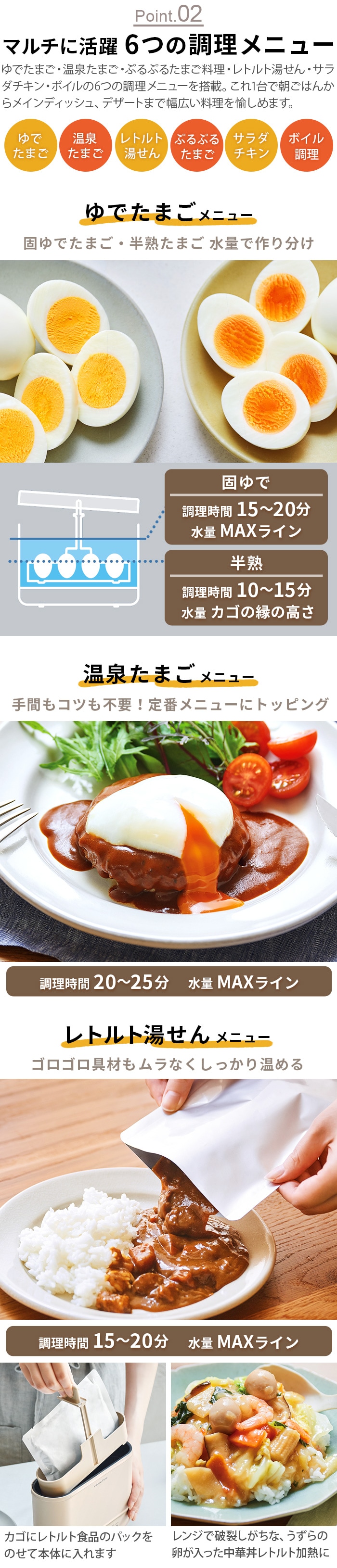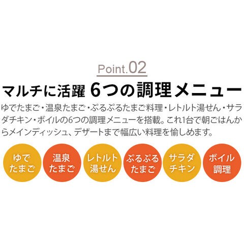 | 鶏卵1~4個対応 6つの調理メニュー ゆでたまご・温泉たまご・ぷるぷるたまご・レトルト湯せん・サラダチキン・ボイル 専用レシピブック付き(8品目掲載) |