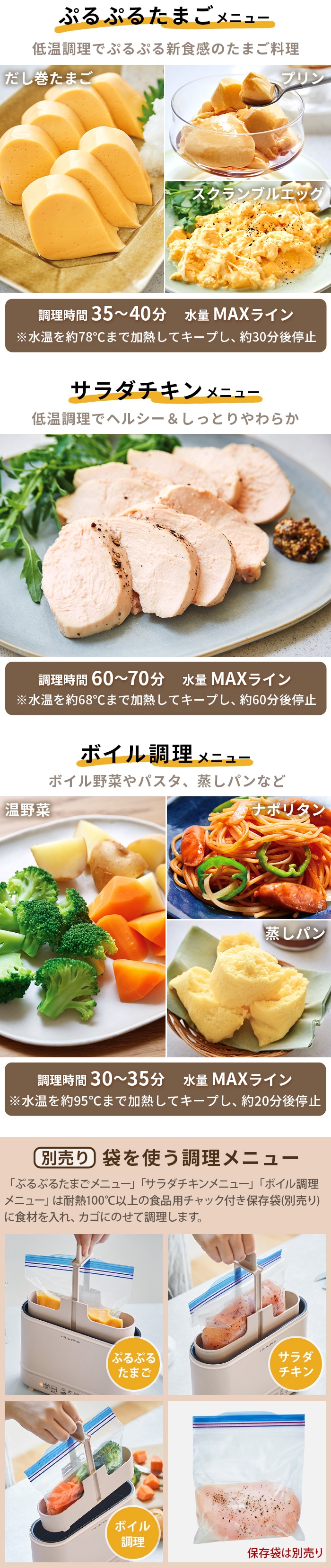 | ぷるぷるたまご・レトルト湯せん・サラダチキン・ボイルメニューの調理には耐熱100℃以上の保存袋(別売り)が必要です。保存袋は付属しません。 空焚きは行わないでください。 調理する際は必ず付属のカゴを使用してください。 使用中や使用後しばらくは、フタ・カゴ・本体の一部が高温になります。 フタやカゴはミトンなどを使用して外してください。 水以外の液体や食材を直接本体に入れないでください。 調理をする際は壁・家具・カーテンなどから上面30cm以上、後面・側面10cm以上離れた水平な場所に設置してください。 |