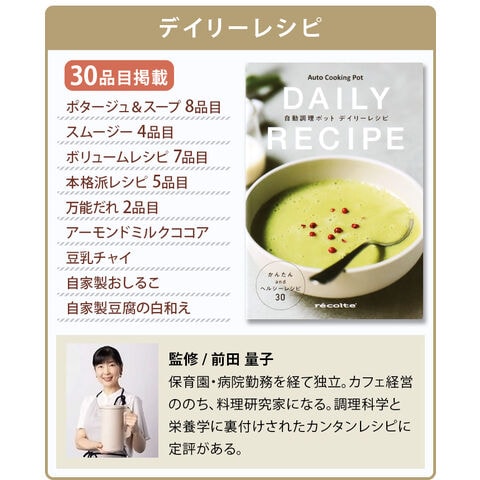 recolte 自動調理ポット[RSY-2]専用のレシピブック [毎日食べたいスープレシピ] 全31品目のレシピ掲載 ページ数:39ページ レシピ監修:エダジュン(料理研究家・管理栄養士) [デイリーレシピ] 全30品目のレシピ掲載 ページ数:36ページ レシピ監修:前田量子(料理研究家・管理栄養士) |